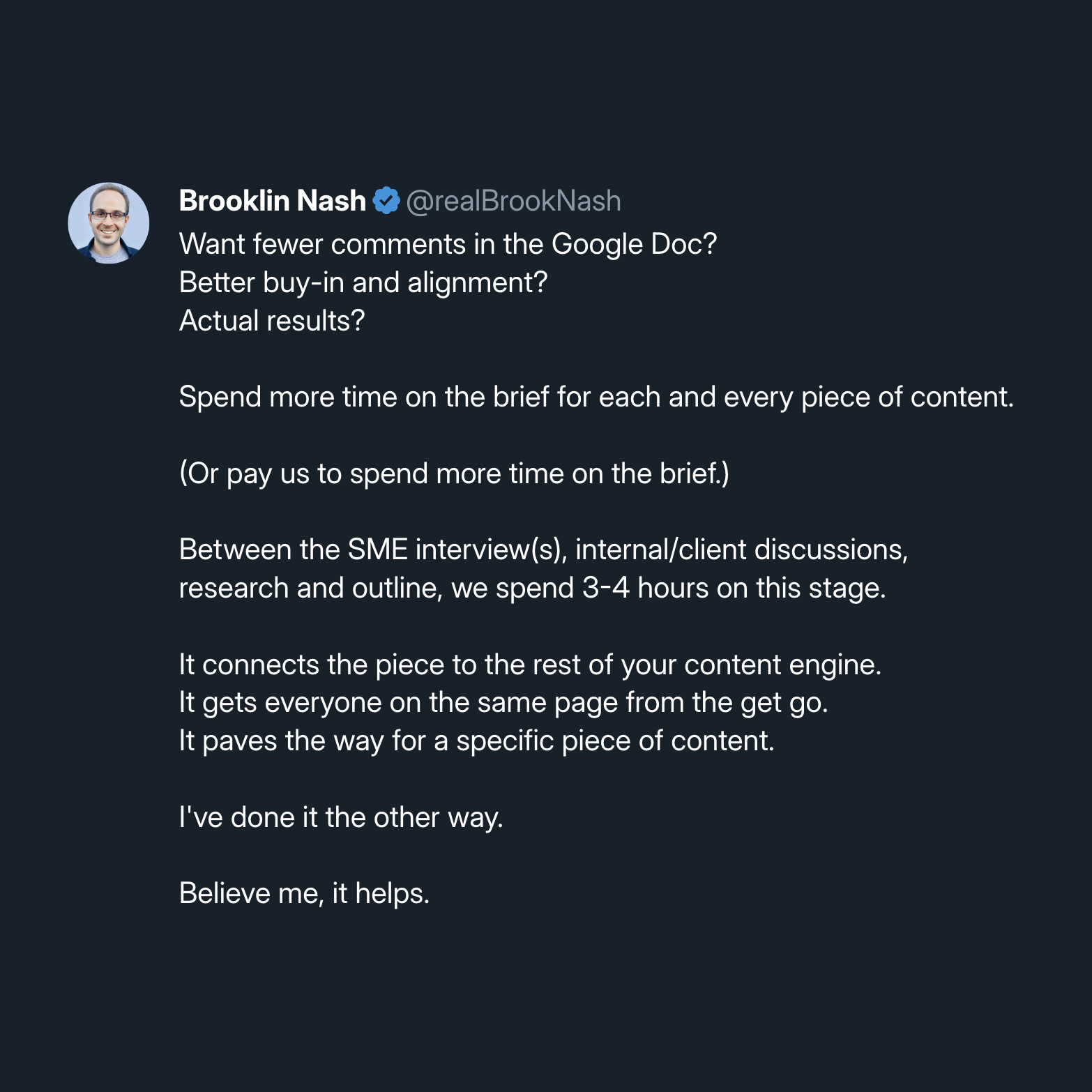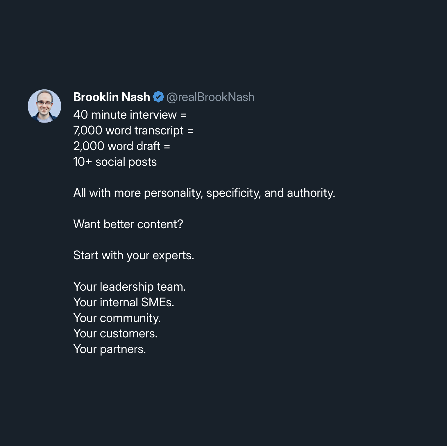 “Everything that comes before you open up that draft, or before you assign it to a writer, is the most critical piece. Unless you’re a CTO opening up a blank page who can speak authoritatively to other CTOs based on your lived experiences, you have to put in an upfront work so what you produce is grounded in expertise.” Brook says.